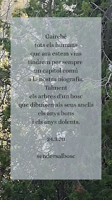 Trenta poemes escrits durant el confinament de març-juny de 2020. Em vaig proposar editar els textos amb una foto feta dins o des de casa durant aquells dies. Només ho vaig incomplir un dia quan vaig poder començar a sortir i en el darrer poema, quan finalment vaig poder anar a La Bauma. Poder sortir de casa (i el final del silenci) em va semblar que indicava el final del projecte.